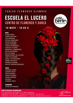 El próximo domingo 19 de Mayo en la sala Café Berlín, os esperan en una velada muy flamenca, los alumnos de Baile, Cante y Percusión del Centro de Flamenco y Danza El Lucero , donde mostrarán parte de su aprendizaje del curso!